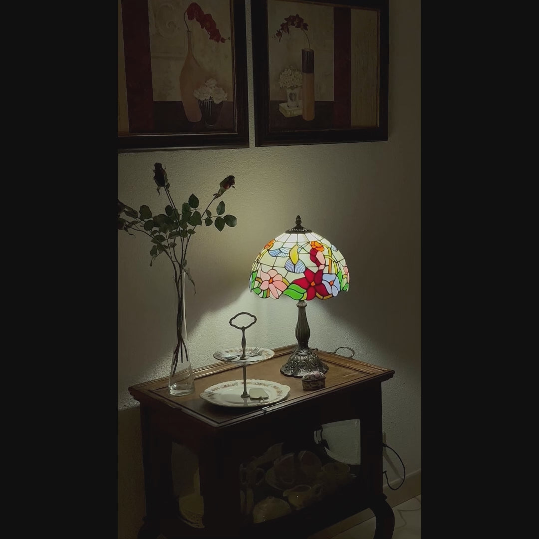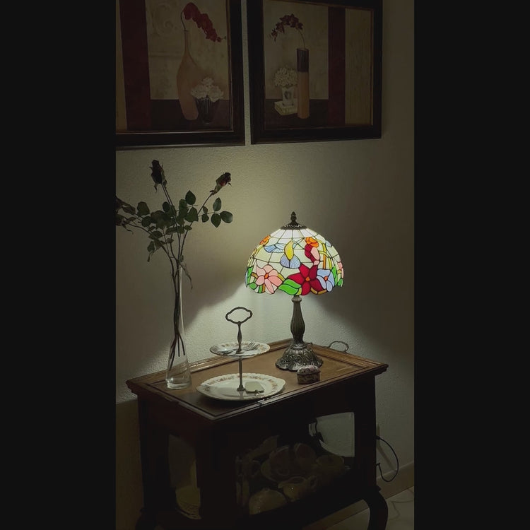 Die Tiffany Lampe Colibrì ist eine handgefertigte Tischlampe, hergestellt nach der originalen Tiffany Kupferfolien Technik. Der Schirm zeigt ein farbenfrohes Blumenmuster in Rot, Rosé, Gelb und Cremeweiß, in dem ein Kolibri anmutig zwischen dem Grün nach Nektar sucht. Diese Kombination macht Colibrì zu einer lebendigen Glas in Blei Lampe, die Wärme und Detailreichtum in jedes Interieur bringt. Dank ihrer klassischen Form und des dunkelbronzenen Fußes fügt sich diese Lampe perfekt in die Eleganz einer Vintage Lampe ein.