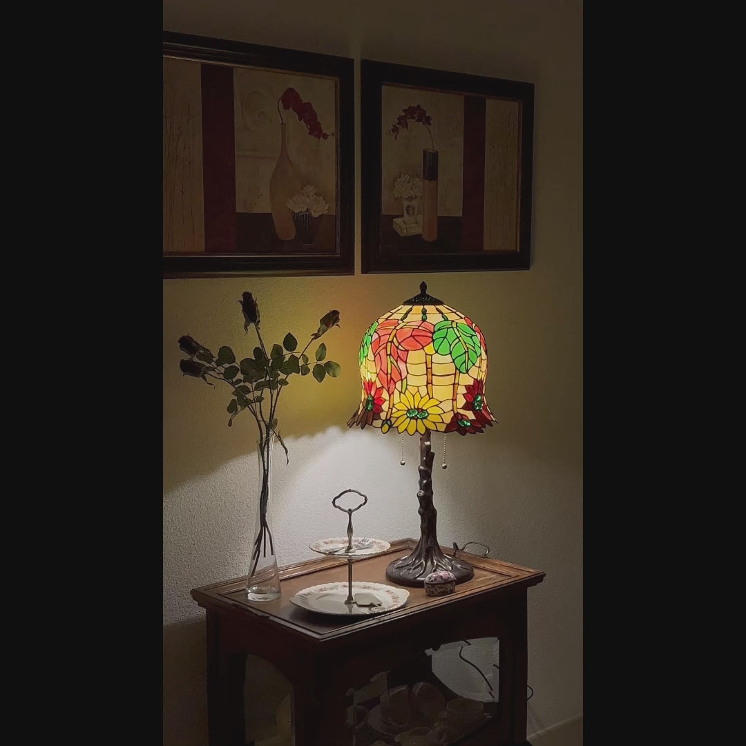 Die Tiffany Lampe Luminosa ist eine handgefertigte Tischlampe, hergestellt nach der originalen Tiffany Kupferfolien Technik. Der runde Schirm zeigt ein verspieltes Muster aus Herbstblättern in Rot und Grün, kombiniert mit Blüten in leuchtendem Gelb. Dadurch ist die Luminosa eine echte Glas in Blei Lampe, die Wärme und Farbe in dein Zuhause bringt. Mit ihrer eleganten Form und dem stammförmigen Fuß verkörpert diese Lampe den Charme einer klassischen Vintage Lampe.